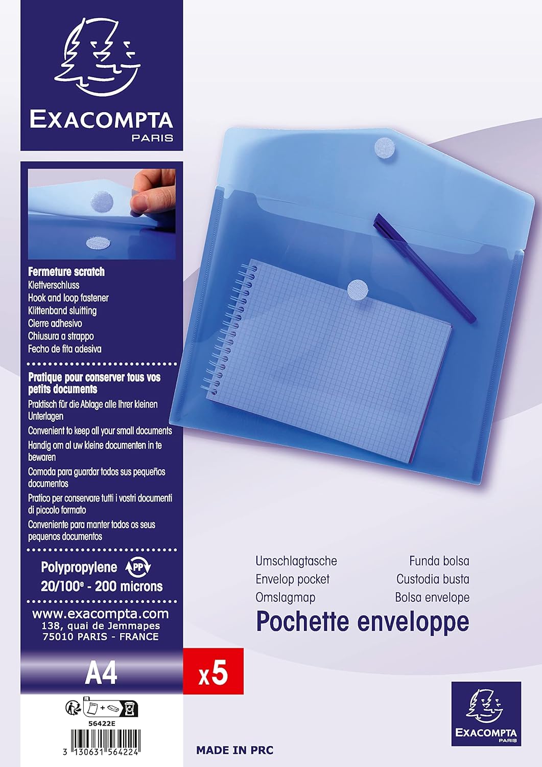 Exacompta 5 Envelop Tassen Pp Met Klittenband Sluiting A4 Blauw