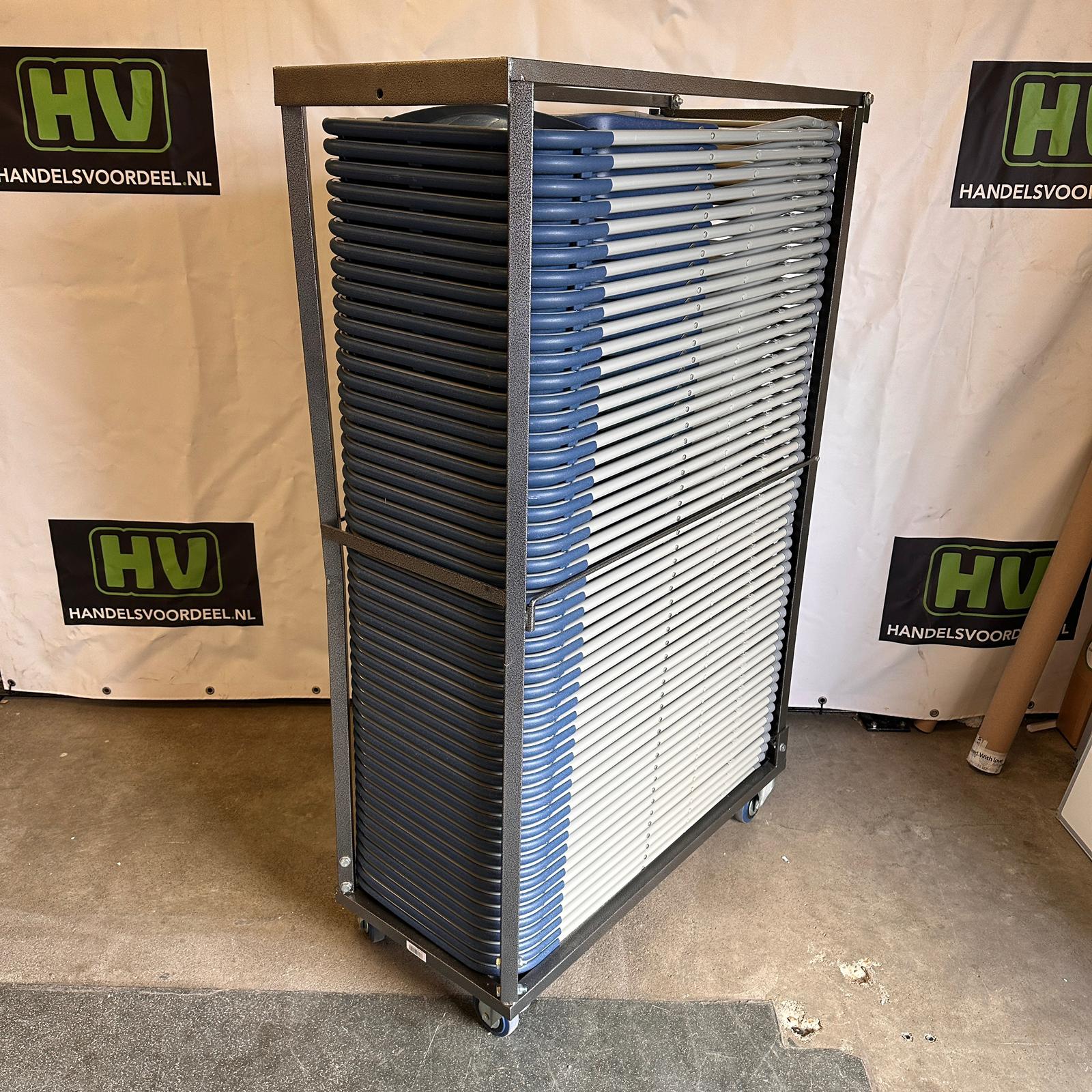 Wagen met stoelen in polypropyleen. Systeem voor vergrendeling van de inhoud van de wagen. Afwerking op basis van hamerslaglak die zeer bestand is tegen krassen. Uitgerust met 2 zwenkwielen met rem en 2 bokwielen.